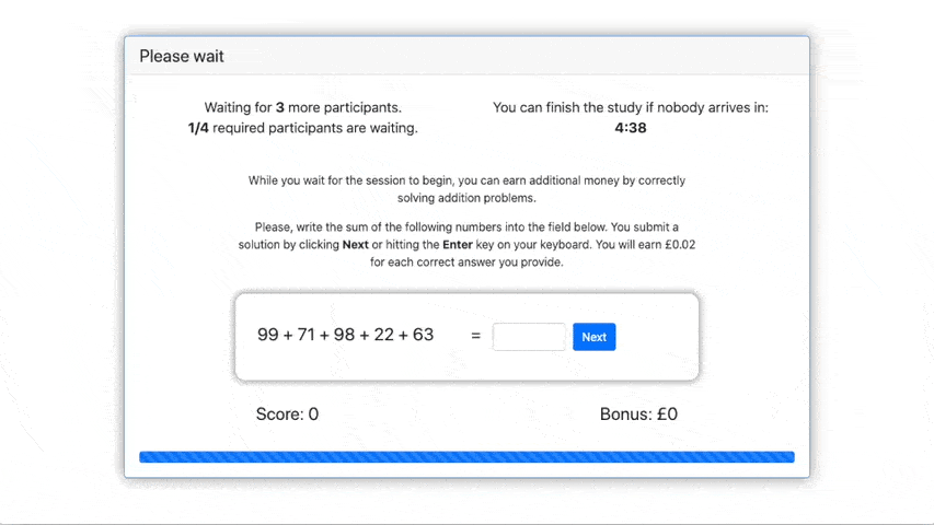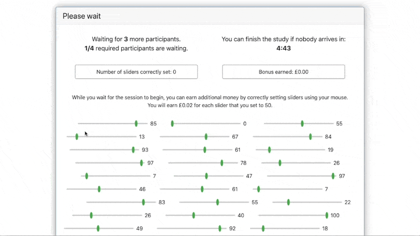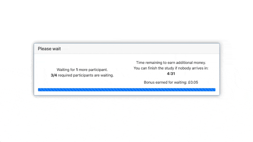 - Inclusion of ‘waiting activities’ that can be used while subjects are waiting for sessions to begin or for decisions to be made by other participants such as: