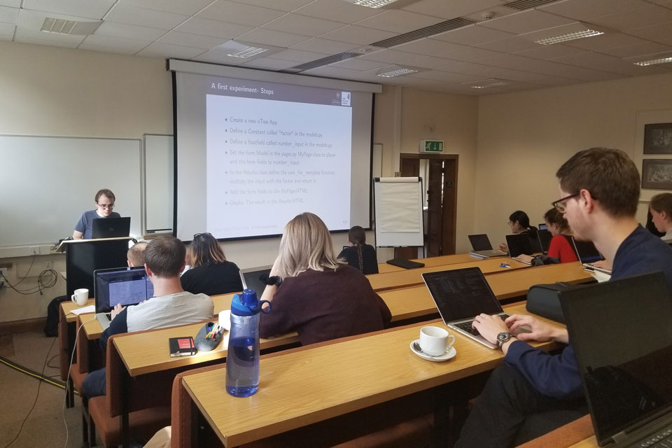 The Centre for Experimental Social Sciences hosted an experimental programming workshop taught by affiliated D. Phil student, Jonas Frey, on 8th-9th of October.  Students and faculty came from various departments and universities to attend a complimentary crash course in Python programming and its specific application to oTree, a software designed primarily for the creation of online social science experiments. Attendees spent the first day learning the basics of Python programming and the second day seeing how their newly developed skills could be applied to programming their own experiments.  We look forward to working with the attendees to run their newly programmed experiments at CESS!